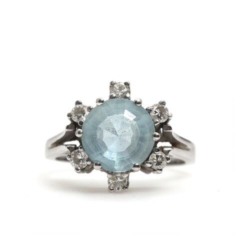 2550/1143AarhusAn aquamarine and diamond ring set with a circular-cut aquamarine encircled by six brilliant-cut diamonds, mounted in 14k white gold. Size 52.