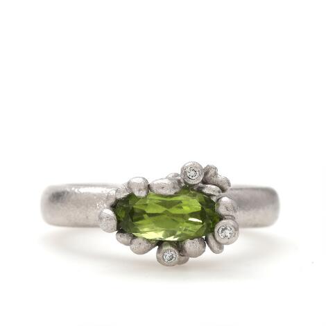 2550/1139AarhusCharlotte Lynggaard: A "Flower basket" ring set with an oval-cut peridote and diamonds. Size 57.