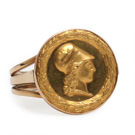 2550/1104AarhusFinn E. J. Botler: A 14k gold doctor's ring with a 23k gold plate embossed with Minerva's head. Weight app. 14 g. Size 69.