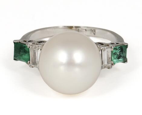 2550/1156LyngbyA pearl ring set with a South Sea cultured pearl flanked by diamonds and emeralds, mounted in platinum. Size 56.