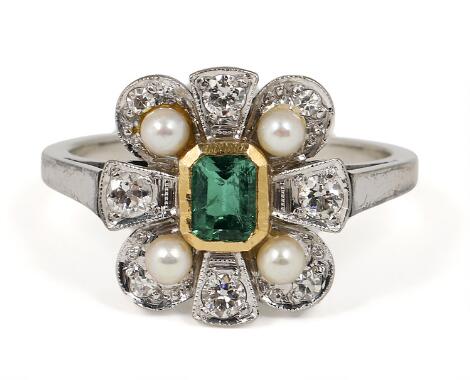 2550/1158LyngbyAn emerald-, pearl- and diamond ring. mounted in 14k gold and white gold. Weight app. 5 g. Size 58.