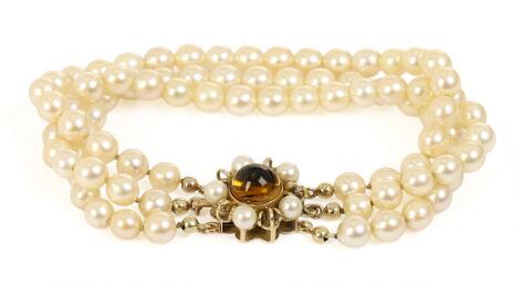 2550/1149LyngbyWilly Junget: A three-strand pearl bracelet set with a clasp set with a citrine and pearls, mounted in 14k gold. L. 19.5 cm.