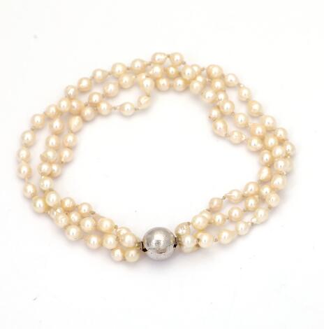 Treradet perlekæde i forløb prydet med talrige perler, monteret med smykkelås af 14 kt. hvidguld. L. 39-42 cm.