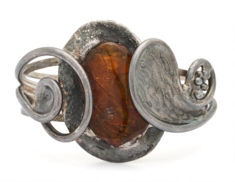Oplukkelig ravarmring af sølv prydet med rav. Vægt ca. 86,5 g. Front B. 4,8 cm. Indvendig diam. ca. 6,5 cm.