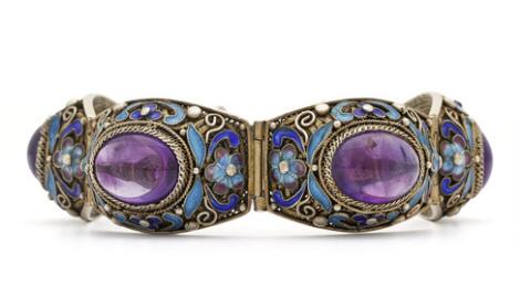 Armbånd af sterlingsølv prydet med fire ametyster, emalje og filigran. Vægt ca. 51 g. B. 20 mm. L. 17 cm.