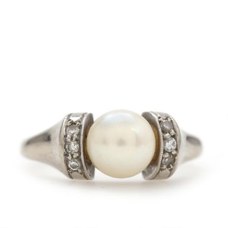 Perle- og diamantring af 14 kt. hvidguld prydet med perle og diamanter. Str. 53.