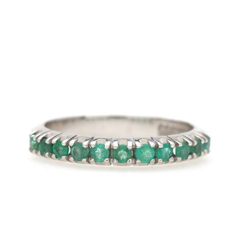Smaragdring af 14 kt hvidguld prydet med talrige smaragder. Str. 55.