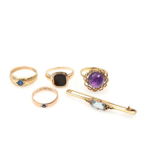 En samling smykker af 14 kt. guld bestående af fire ringe og en broche. Str. 54-59. (5)