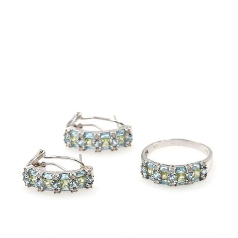 Spinel-, peridot-, og diamantring og ørestikker af 14 kt. hvidguld hver prydet med spinel, peridot og diamanter. Str. 58. (3)