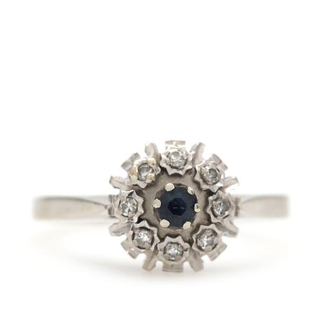 Safir- og diamantring af 14 kt. hvidguld prydet med safir omkranset af diamanter. Str. 56.