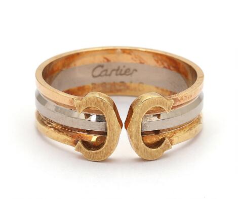 Cartier: A "Double C" ring of 18k tri-coloured gold. Serial no. B64516. Weight app. 3.5 g. W. 7 mm. Size 52.