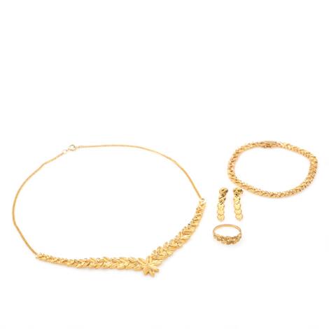 2548/1248AarhusSmykkesæt af 22 kt. guld bestående af halskæde, armbånd, ørestikker samt ring. Str. 56. (5)