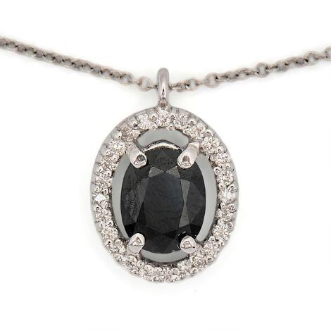 2548/1230LyngbySafir- og diamanthalskæde af 18 kt. hvidguld prydet med ovalslebet safir og diamanter. L. 41,5 cm.