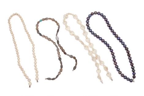 2548/1282LyngbyFire halskæder prydet med blandt andet perler og røgkvarts, monteret med dubsko. L. 40-43,5 cm. (4)