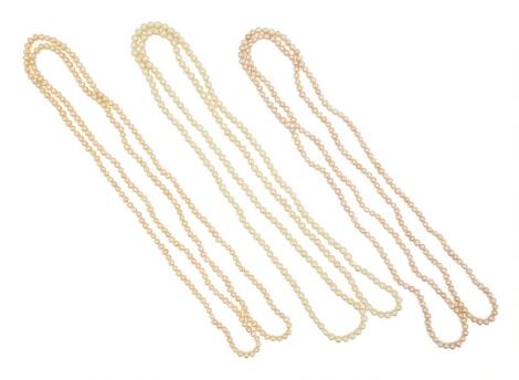 2548/1264LyngbyTre perlehalskæder prydet med talrige ferskvands kulturperler. Perlediam. ca. 4-7 mm. L. ca. 137 og 140 cm. (3)