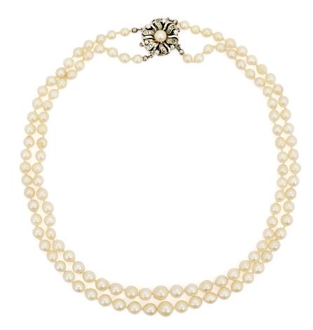 2548/1267LyngbyTo-radet perlehalskæde prydet med talrige kulturperler og perlelås af sølv. Perle diam. 5,5-8,4 mm. L. 50 cm.