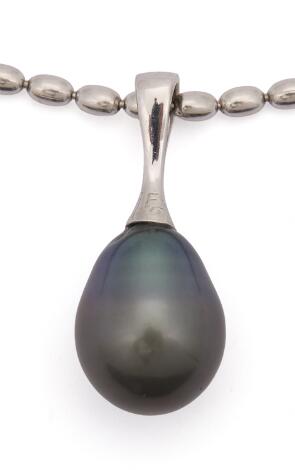 2548/1238LyngbyPerlevedhæng af 12 kt. guld prydet med Tahiti kulturperle. Halskæde af 14 kt. hvidguld. L. 50 cm. (2)
