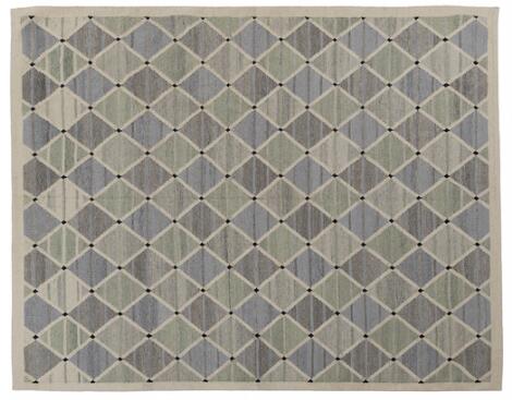 2603/3054LyngbyTæppe af uld med geometrisk mønster i blå, grå og grønne nuancer på mælkehvid bund. L. 290. B. 245.