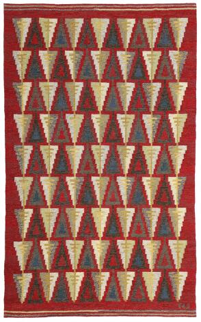 930/473LyngbyPolly Björkman: Håndvævet tæppe af uld i "rölakan" teknik. Geometrisk polykromt mønster.
