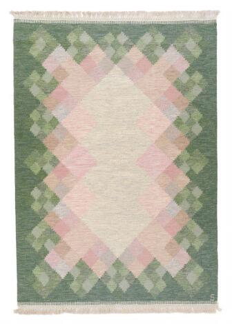 2548/570LyngbyBrita Svefors: Håndvævet tæppe af uld i “rölakan” teknik. Geometrisk dekor i lyserøde og grønne nuancer.