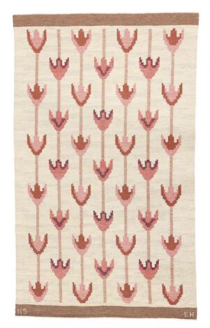 2548/564LyngbyMaj Svanström: Håndvævet tæppe af uld i “rölakan” teknik. Stiliseret blomster mønster i lyserøde og brune nuancer på lys bund.