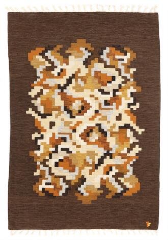 2548/639LyngbyErik Lundberg: "Korall". Håndvævet tæppe af uld i “rölakan” teknik. Geometrisk mønster i orange, brune, gule og grå nuancer på brun bund.