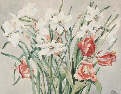 2549/43Olga Alexandrovna: Røde tulipaner og pinseliljer. Sign. Olga. Vandfarve på papir. Bladstørrelse 26 x 33 cm.