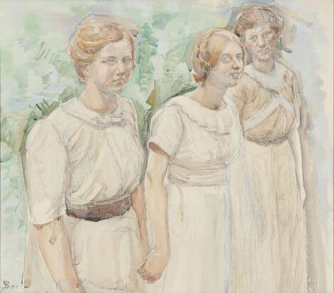 2549/37Fritz Syberg: Tre unge kvinder i sommerkjoler. Sign. monogram 1915. Vandfarve og bly på papir. Lysmål 67 x 77 cm.