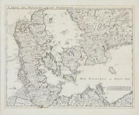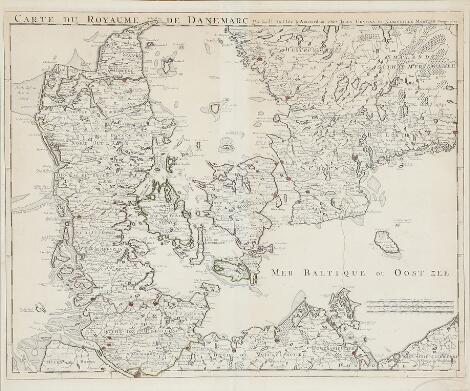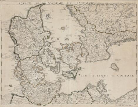 2549/8052Guillaume Delisle: "Carte du Royaume de Danemarc". 1710. Håndkoloreret kobberstik. Lysmål 49,5 x 64 cm.