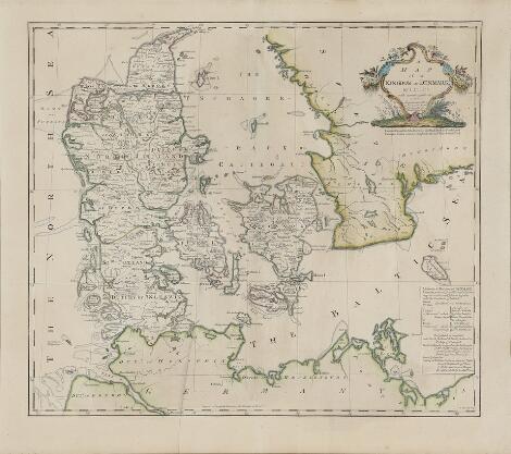 2549/8054Jean Palairet: "A Map of the Kingdom of Denmark". 1760. Håndkoloreret kobberstik. Lysmål 54,5 x 61,5 cm.