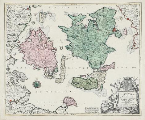 2549/8053Frederik de Wit, Reinier & Josua Ottens: "Dania Regnum". 1727. Håndkoloreret kobberstik. Lysmål 53 x 61,5 cm.