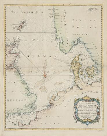 2549/8058Nicolas Tindal: "A Correct Chart of the German Ocean". 1745. Håndkoloreret kobberstik. Lysmål 51 x 40 cm.