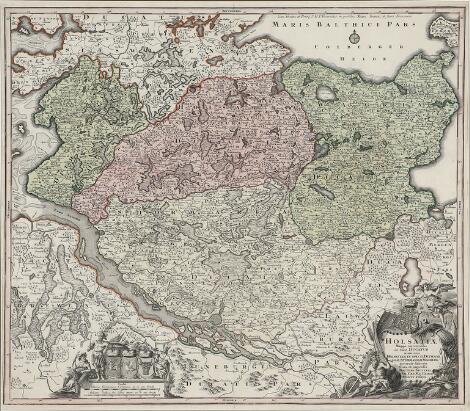 2549/8048George Matthäus Seutter: "Holsatiæe Mappa Universalis". 1730. Håndkoloreret kobberstik. Lysmål 51 x 59 cm.