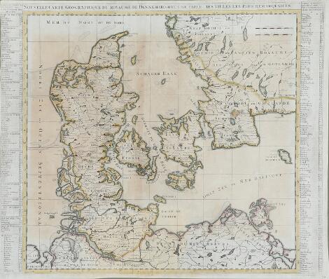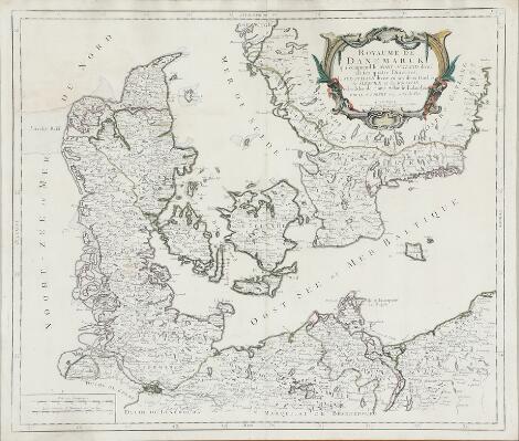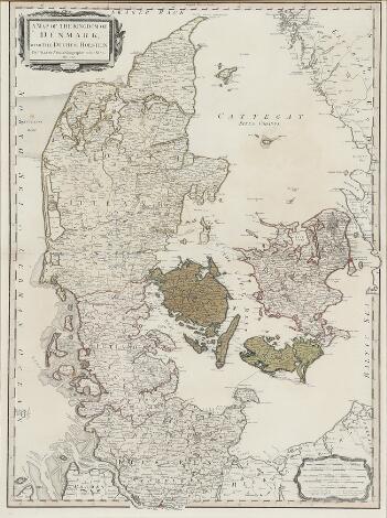 2549/8047Henri Abraham Chatelain: "Nouvelle Carte Geographique du Royaume de Dannemarck". 1710. Håndkoloreret kobberstik. Bladstørrelse 52 x 60 cm.