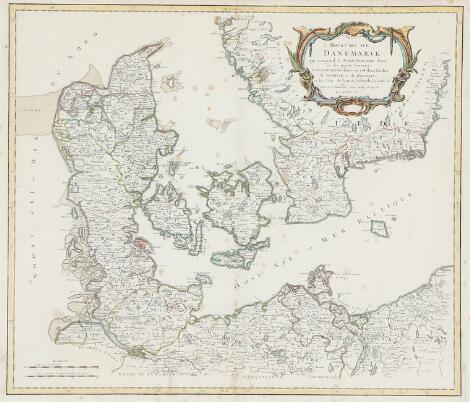 2549/8055Guillaume Delisle: "Carte du Royaume de Danemarc". 1742. Håndkoloreret kobberstik. Lysmål 52 x 62 cm.