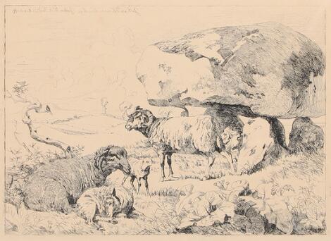 2549/48Johan Thomas Lundbye: Faar ved en Gravhøj”. Sign. spejlvendt i trykket med monogram 1838. Radering. Lysmål 18.5 x 25 cm.