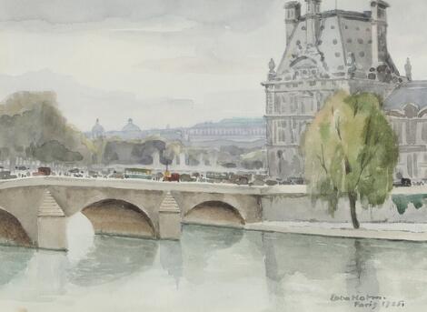 2549/58Ebba Holm: Parti fra Paris med udsigt til Louvre. Sign. Ebba Holm, Paris 1925. Akvarel på papir. Lysmål 20 x 26 cm.