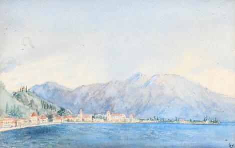 2549/88Ubekendt maler, 19. årh.: Parti fra Gardasøen. Sign. monogram. Akvarel på papir. Lysmål 17 x 26.