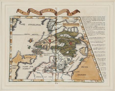 2549/8000Gaspar & Melchior Treschel: "Norbegia et Gottia". 1535. Handcoloured engraving. Visible size 35.5 x 47 cm.