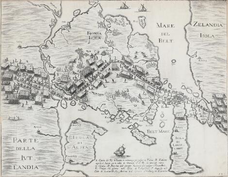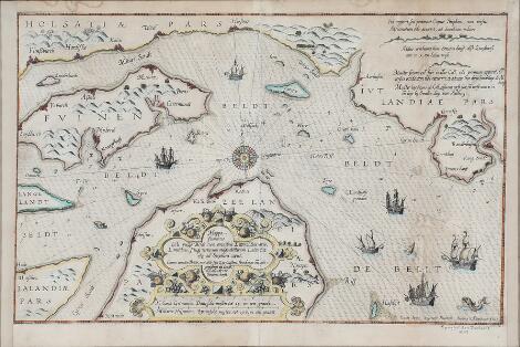 2549/8004Lucas Jansz Waghenaer: "Mappa Fluminis Dicti Vulgo Beldt cum Omnibus Littoralisbus Oris". 1585. Handcoloured engraving. Visible size 37.5 x 56 cm.