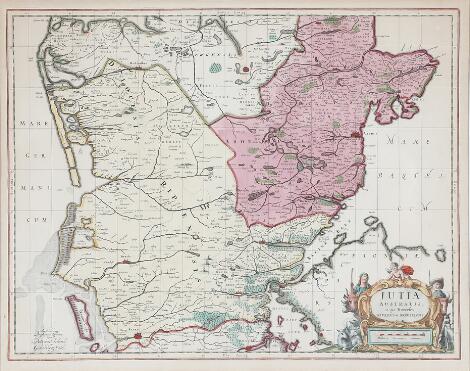 2549/8018Gerard Valck, Peter Schenk: "Jutia Australis (...)". C. 1705. Handcoloured engraving. Visible size 45.5 x 58 cm.