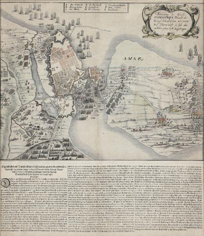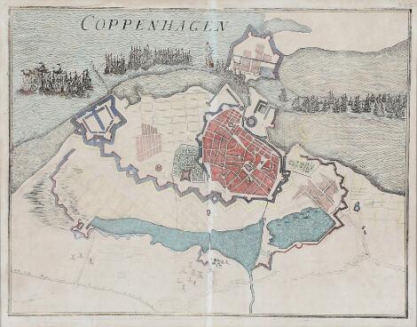 2549/8020Unknown cartographer, 17th century: A map of Copenhagen. C. 1680. Handcoloured engraving. Visible size 45 x 39 cm.