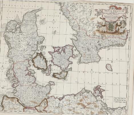 2549/8009Frederik de Wit: "Dania Regnum". 1700. Handcoloured engraving. Visible size 51 x 59 cm.