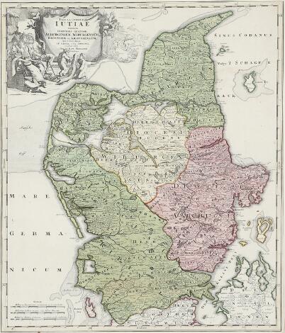 2549/8010Gerard Valck, Pieter Schenk: "Totius Iutiæ Generalis Accurata Delincatio". 1705. Handcoloured engraving. Visible size 51.5 x 61.5 cm.