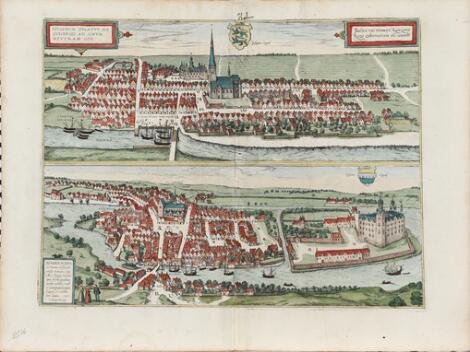 2549/8015Braun & Hogenberg: "Hvsemvm Dvcatvs Slesvicensis ad Sinum Heveram Opp". 1588. Handcoloured engraving. Sheet size 42.5 x 56 cm.