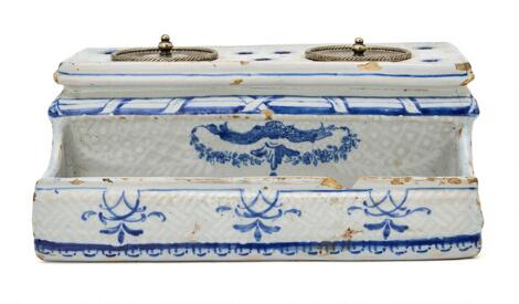 2545/266Svensk skrivetøj af fajance, dekoreret i blåt. Mærket Rörstrand og dateret 1754. Blæk- og sandhus af forsølvet metal.