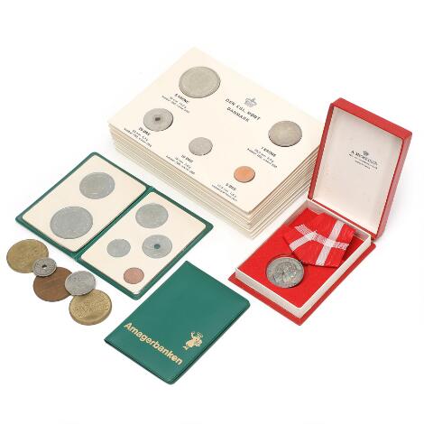 2545/51982 albums nd box with commemoratives (8 pcs), 10 øre 1959, coin set, "Den Kgl. Mønt", 1986, various medals in Ag and coins from Greenland, Norway and Sweden