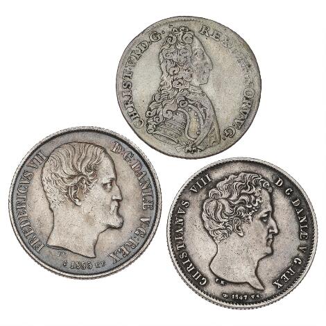 2545/5206Christian VI, 24 skilling 1731, H 6B, cond. F, Christian VIII, 1 rigsbankdaler 1847 VS, cond. VF, and Frederik VII, 1 rigsdaler 1855 FF, cond. VF, in total 3