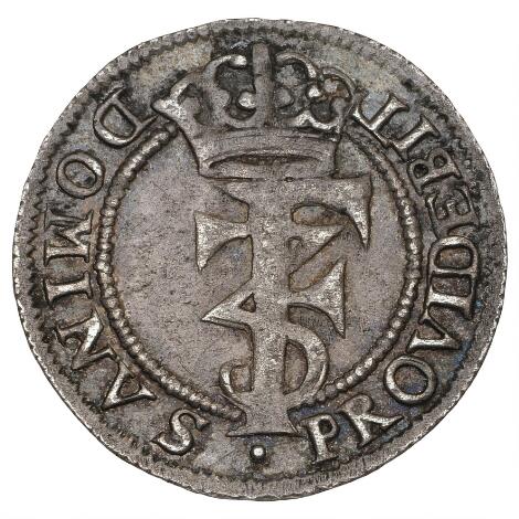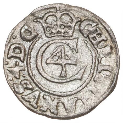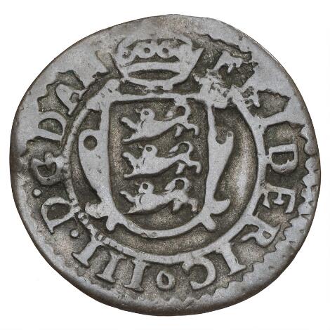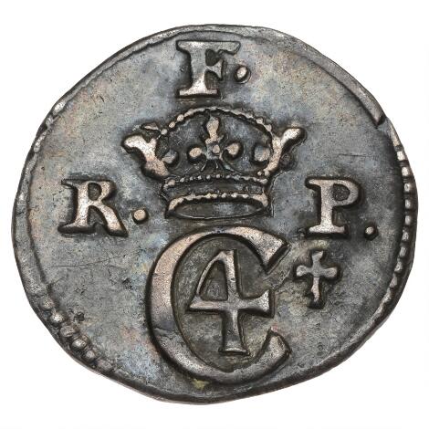 2545/5126Christian V, skilling 1681, H 75B, S 64, sjælden variant der mangler kongens ciffer ( V ) i omskriften