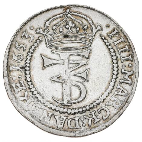 2545/5104Frederik III, 4 mark / krone 1653, H 95A, Aagaard 28.5 - pænt eksemplar for typen